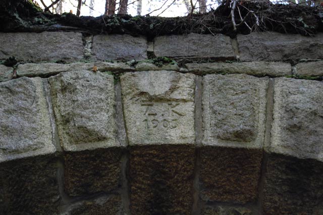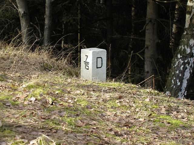 Kopfstein mit den Initialien 'ZK 1905 (Zdeněk Kruliš)' am Durchlass nach der Staatsgrenze.