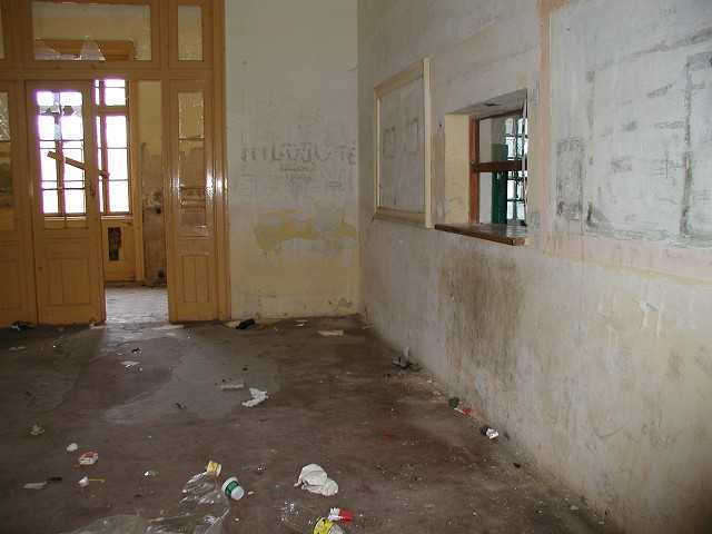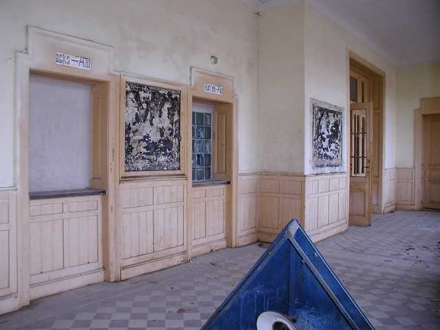 Alle Türen sind vernagelt. Durch die eingeschlagenen Scheiben der Bahnhofsfenster bietet sich