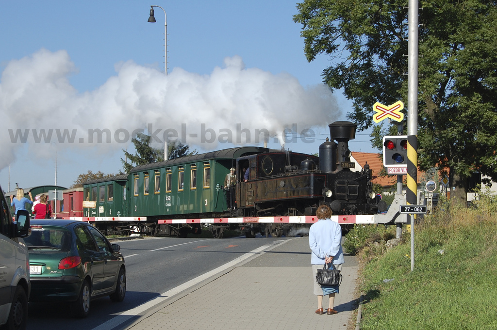 Am Bahnübergang in Kaznějov/Tschechien. Der Museumszug zum Tag der Eisenbahn 2013 nimmt Kurs