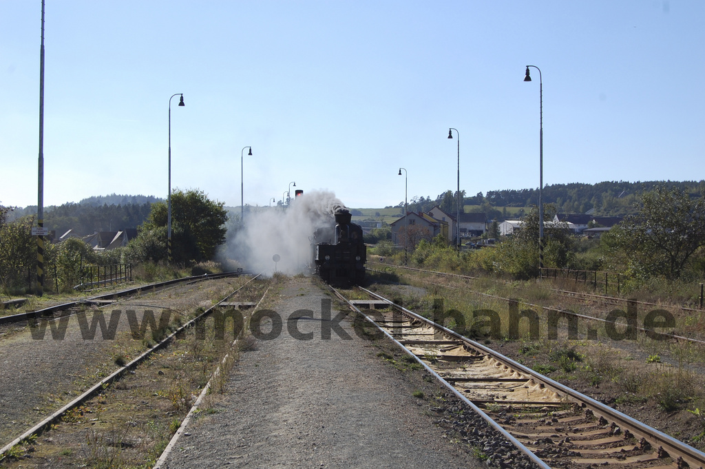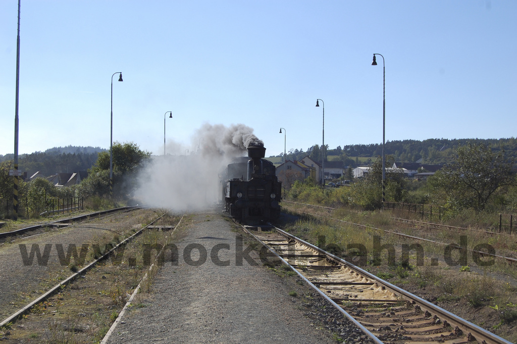 Einfahrt des Museumszugs mit Lok 310-072 in Mladotice/Tschechien zum Tag der Eisenbahn 2013.
