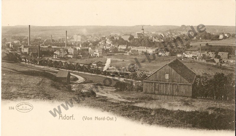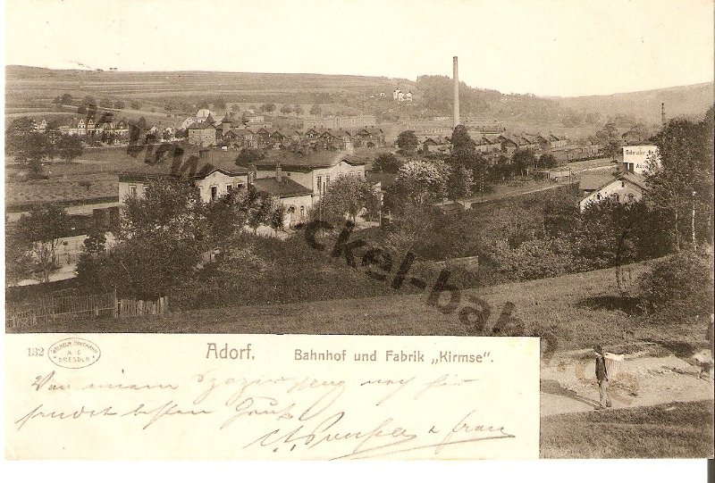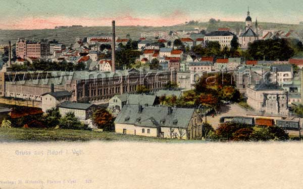 Adorf 1904: links Textilfabrik Gebr. Uebel, Bildmitte unten das Hotel 'Victoria'. Sammlung Peter Schindel
