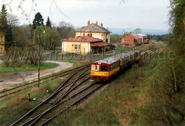 1992: Triebwagenzug mit 810 153-7 auf dem Bahnhof Hranice v Čechách (Rossbach) bereit zur Rückfahrt. Sammlung Wilfried Rettig