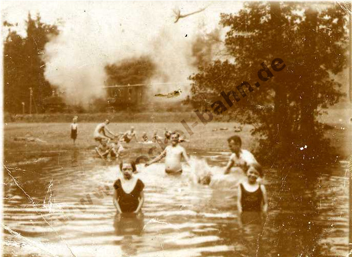 Der Teich unterhalb der ehemaligen Deponie Adorf wurde früher als Badeteich genutzt. Direkt an der Trasse gelegen, dampft im Hintergrund der Mockel in Richtung Arnsgrün vorbei. Sammlung Gottfried Wenzl, Adorf