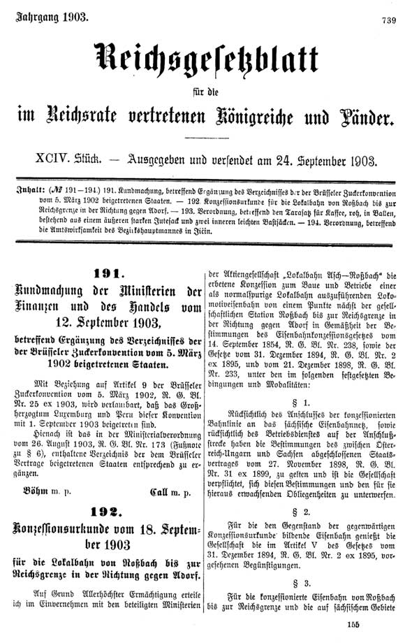 erbetene Konzession zum Baue und Betriebe einer als normalspurige Lokalbahn auszuführende Lokomotiveisenbahn von einem Punkte nächst der gesellschaftlichen Station Roßbach bis zur Reichsgrenze in der Richtung gegen Adorf in Gemäßheit der Bestimmungen des Eisenbahnkonzessionsgesetzes vom 14. September 1854, R.G.Bl.Nr. 238, sowie der Gesetze vom 31. Dezember 1894, R.G.Bl.Nr. 2 ex 1895, und vom 21. Dezember 1898, R.G.Bl.Nr. 233, unter den im folgenden festgesetzten Bedingungen und Modalitäten: