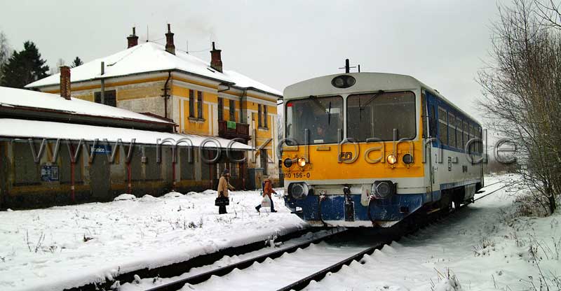 Wochentags kommt zweimal täglich der Triebwagen aus Cheb/Eger nach Hranice/Roßbach. Proteste der Bürger haben verhindert, dass die Strecke in diesem Monat stillgelegt wird.